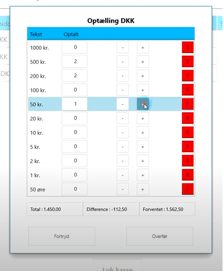 Sammentæller Seddel og mønt antal ved kasseafslutning.